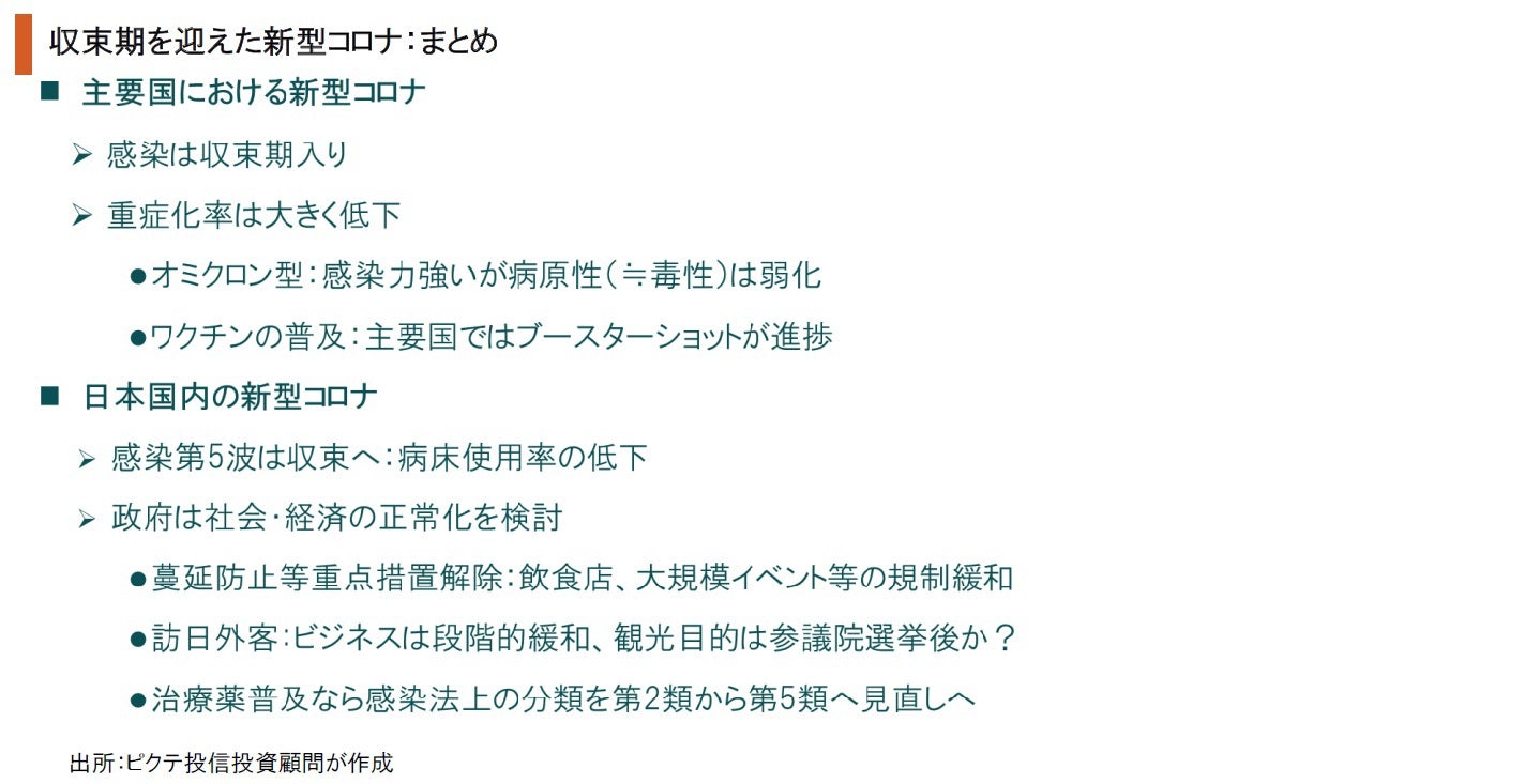 新型コロナの感染拡大が収束に向かい、主要国では社会・経済活動の正常化へ向け規制緩和が進みつつある。日本でも岸田政権は蔓延防止措置の解除に踏み切った。今後の課題は、ワクチン接種をさらに進め、経口治療薬の処方拡大への準備を進めることだろう。さらに、政府は今夏にも4回目のワクチン接種を検討している模様だ。そうした条件が整えば、新型コロナは感染症法の第2分類から、季節性インフルエンザと同じ第5類への見直しが行われると見られる。また、ビジネス目的及び長期在留資格を持つ外国人の入国を段階的に認め、7月10日の参議院選挙後にも観光目的の訪日客も受け入れを開始するのではないか。