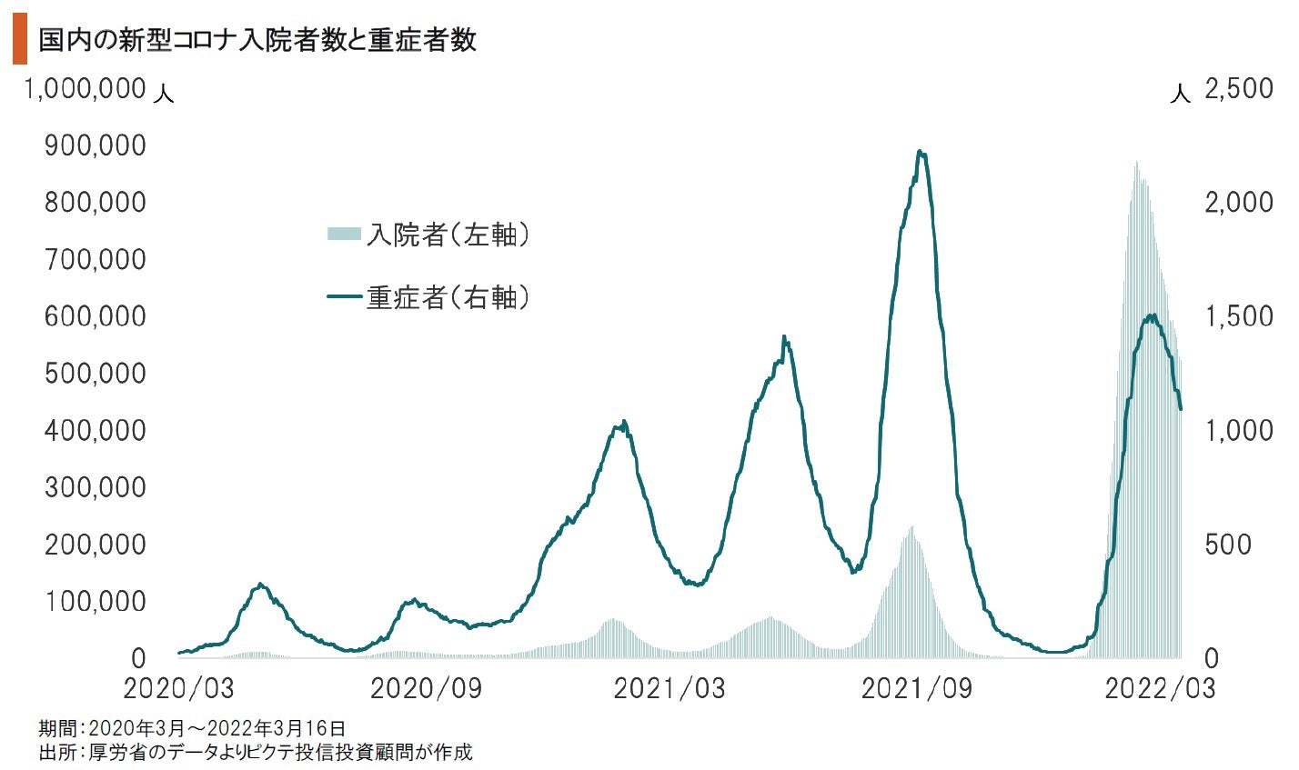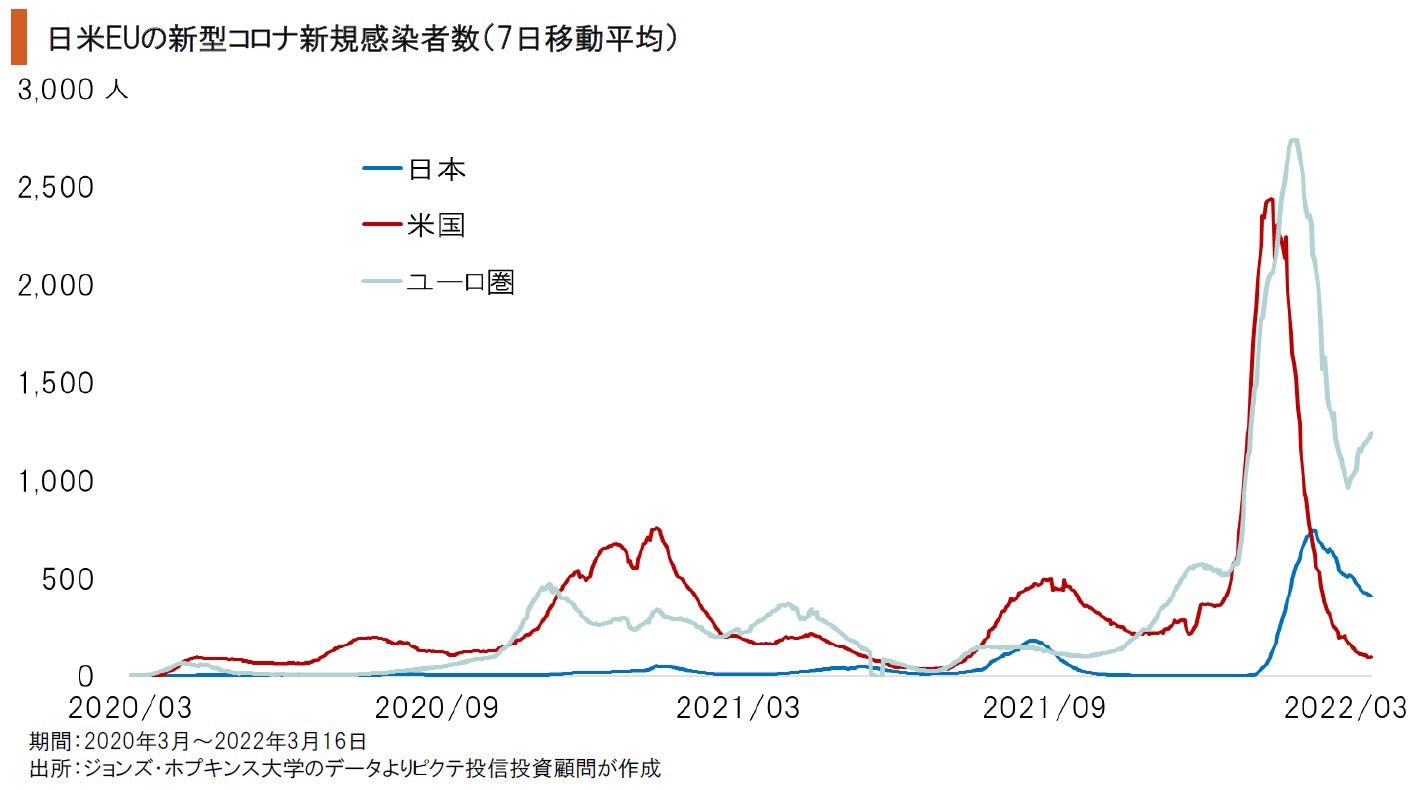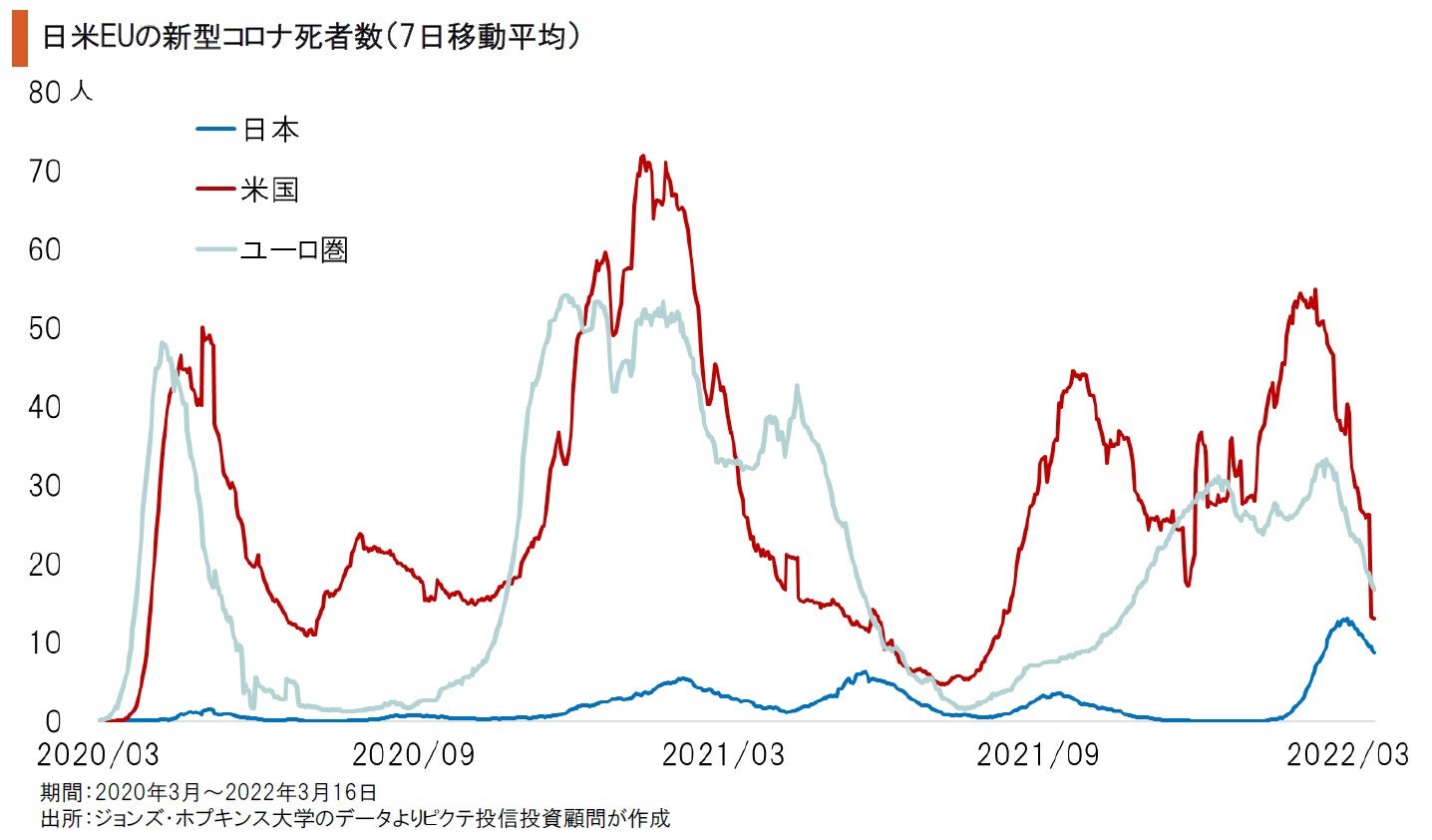 国際社会、そして市場の注目はウクライナ危機の衝撃に注がれているが、2020年の年初から2年以上に亘り世界を苦しめてきた新型コロナ禍への主要国の政策対応に明らかな変化が見られるようになった。各国政府は、社会・経済の正常化へ向け舵を切りつつある。日本においても、18都道府県に発令されていた蔓延防止等重点措置が、3月21日をもって全面的に解除された。昨年末から今年に入っての世界的な感染拡大期の特徴は、感染の過半を占めるオミクロン型の強い感染力、そして病原性(≒毒性)の弱化によるものだろう。重症化率、致死率は明らかに低下、医療供給体制が維持されたことで、重篤な感染者への適切な医療の提供が可能になりつつある。また、主要国においてワクチン接種が進んだことも、重症化の抑制に大きく貢献しているのではないか。さらに、処方が開始された軽症者向けの経口治療薬が普及すれば、”zero Corona”は不可能としても、”with Corona”の下で社会・経済活動は新たな「平時」へと回帰するだろう。この冬の世界的な感染拡大の波が収まりつつあることは、新型コロナ禍が大きな転換点を迎えた可能性を示していると考えられる。