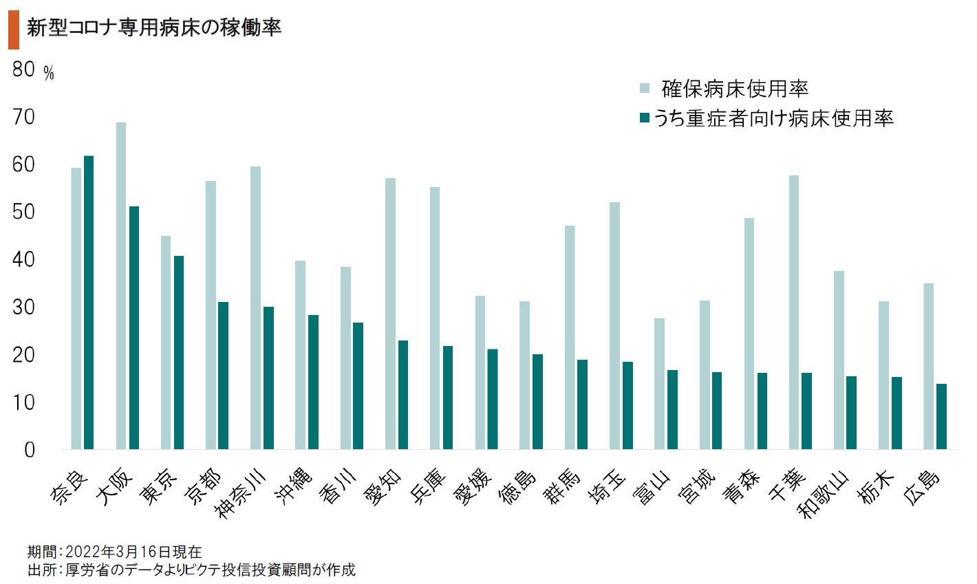 新型コロナの状況を政策的に判断する上で最も重要な指標の1つは病床使用率だ。足下、奈良県、大阪府、京都府など関西圏が全般に高水準だが、重症者向け病床は東京都、神奈川県など人口密集地域でも40%程度まで低下した。医療供給体制に余裕ができれば、重症者に対して適切な医療を施せるため、重篤化を回避する可能性がさらに高まると見られる。