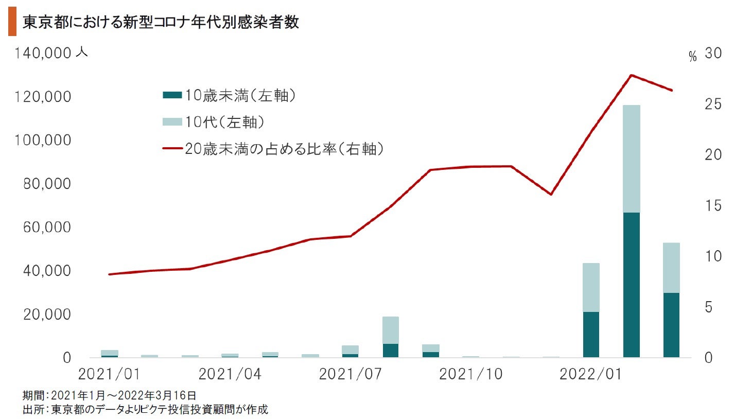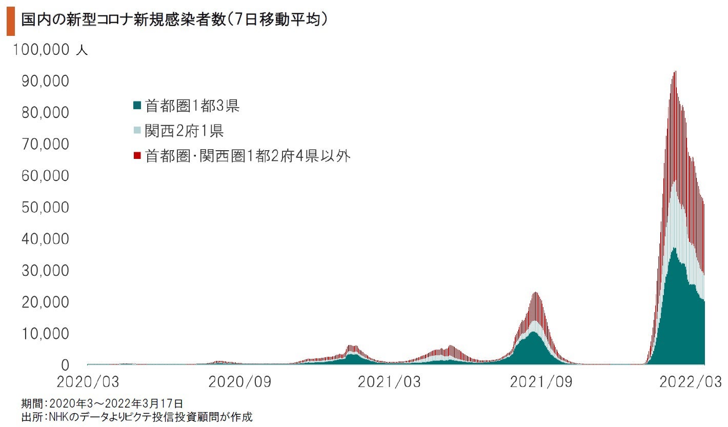 日本国内の数字を見ると、東京都の新規感染者数は2月2日の2万1,576人がこれまでのところ過去最多である。全国だと2月5日の10万5,532人だ。3月後半に入って東京都は1万人を割る日が多くなり、全国でも5万前後の推移となっている。ピーク時と比べ新規感染者は半分程度まで縮小しており、最も大きな波となった第6波は収束期に入ったと言って良いだろう。