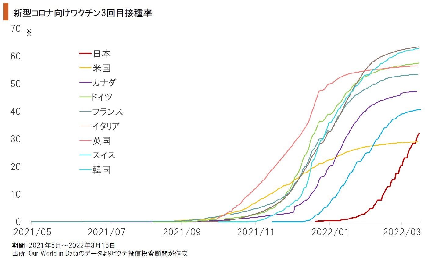 政府は3月21日をもって18都道府県に発令していた蔓延防止等重点措置を全て解除した。感染の中心は高齢者から重症化し難いと言われる若年層に移る一方、高齢者、医療従事者へはワクチンのブースターショットが進んだ。高齢者施設、医療機関のクラスターは重篤化し易いだけに、ワクチン接種の進捗は規制緩和へ向けた重要な判断要素と言える。