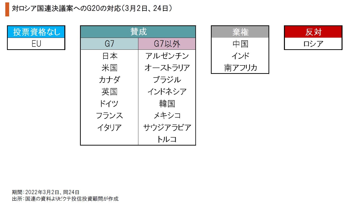 安全保障理事会の常任理事国である国連以外、ロシアが参加している主な国際的枠組みはG20だ。ただし、国連総会で投票権を持つ19ヶ国のうち、G7を中心に15ヶ国がウクライナ危機に関してロシアを批判する2本の決議に賛成した。今年11月にはバリ島で首脳会議が予定されているものの、プーチン大統領が出席する場合、多くの国が参加を見送る可能性が強い。