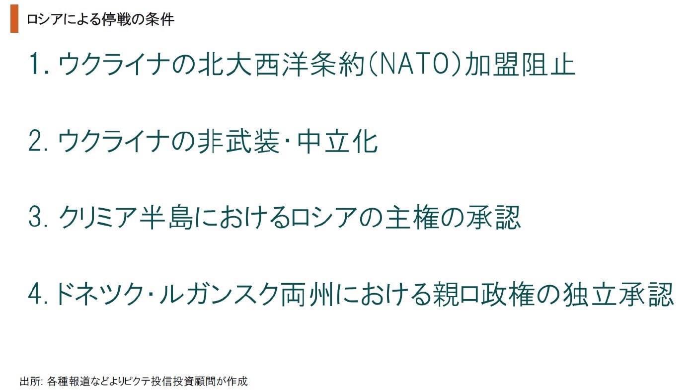 ウクライナへの侵攻に当たり、プーチン大統領は停戦に4つの条件を挙げた。その前提は、ウォロディミル・ゼレンスキー大統領が退陣、ロシアの傀儡政権が樹立されることだったのではないか。ウクライナ側はNATOへの加盟見送りは受け入れる見込みだが、クリミア半島を含む領土に関しては一切の妥協を拒絶している。停戦交渉が長期化する可能性は否定できない。