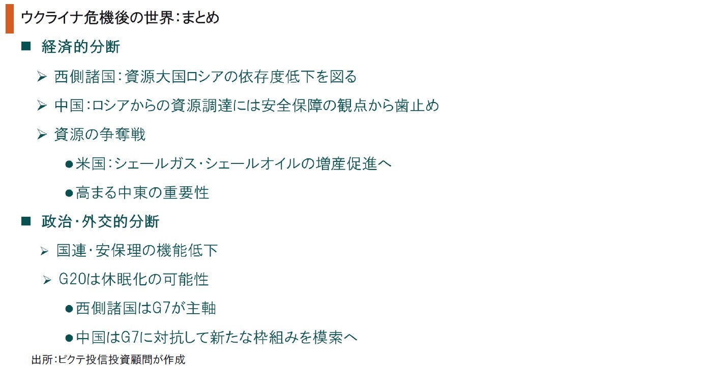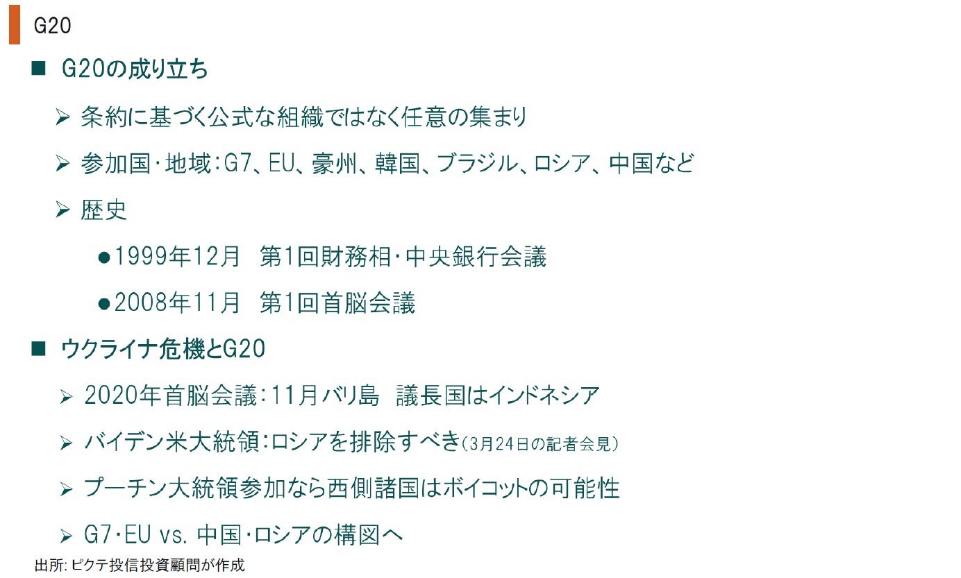 ウクライナ危機では、国連安保理が機能せず、G7がNATOと共に西側諸国の意思決定の主役となった。一方、ロシアのみならず中国がメンバーであるG20に目立つ動きはない。G20が休眠状態になれば、中国はG7に対抗して新たな枠組みを模索する可能性がある。ウクライナ危機が停戦に至っても、米中対立を軸とする国際的な分断の傾向はむしろ強まるだろう。