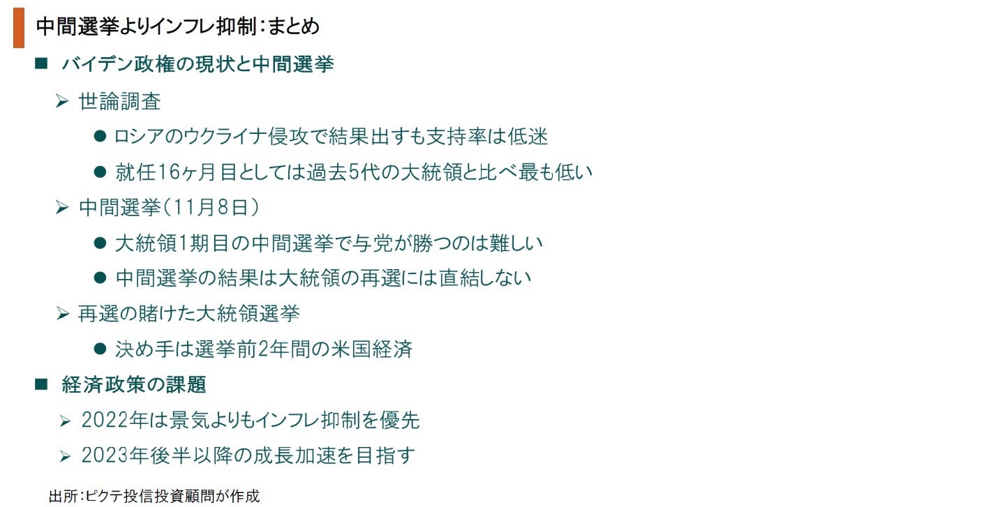 11月の中間選挙はバイデン大統領にとって厳しいものとなり、民主党が上下院で過半数を失う可能性は否定できない。ただし、過去の例から見る限り、1期目の大統領にとって、中間選挙の結果と自らの再選に関連があるわけではなさそうだ。むしろ重要なのは任期後半の景気動向である。バイデン政権は、先行きの景気失速を回避するため、中間選挙の敗北を覚悟して足下のインフレ対策に注力するだろう。つまり、2022年に関しては、米国経済、株式市場共に重苦しい状況を続けるものと見られる。ただし、米国のインフレ圧力は強く、その抑制には相当の根気と時間が必要ではないか。今のところ、バイデン再選へのシナリオは見えていない。
