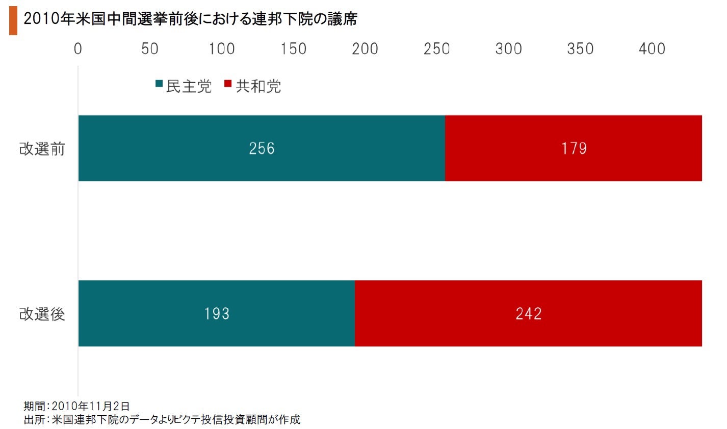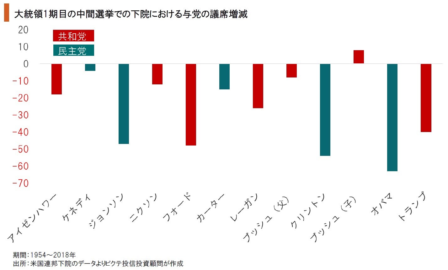 ドワイト・アイゼンハワー大統領以降、戦後、12人の米国大統領の最初の中間選挙に関し、全議席が改選となる連邦下院における与党の結果を見ると、議席を増やしたのはブッシュ(子)大統領のみだ。しかし、再選を目指した11人のうち、7人は2年後の選挙で勝利した。つまり、中間選挙の結果は、かならずしも現職大統領の再選には影響を及ぼしていない。