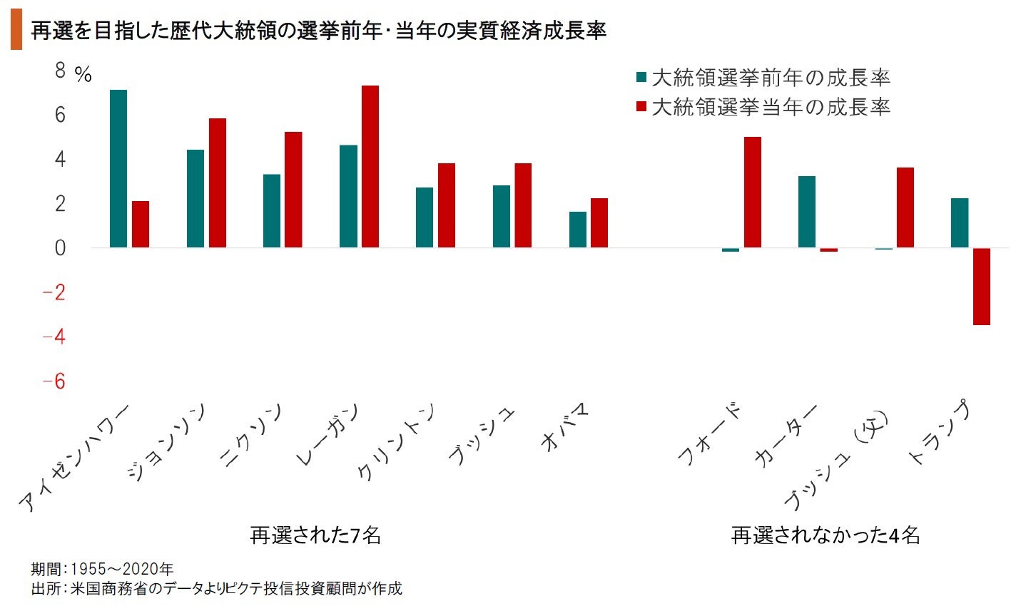 戦後、再選を目指した11人の大統領のうち、再選に成功したのは7人、失敗は4人だ。成功した7人の場合、中間選挙後の米国経済はプラス成長が続いていた。一方、失敗した4人の場合、当該2年間のいずれかの年でマイナス成長を記録していた。つまり、現職大統領が再選される条件は、大統領選挙前2年間の米国経済を明確な拡大期にすることである。