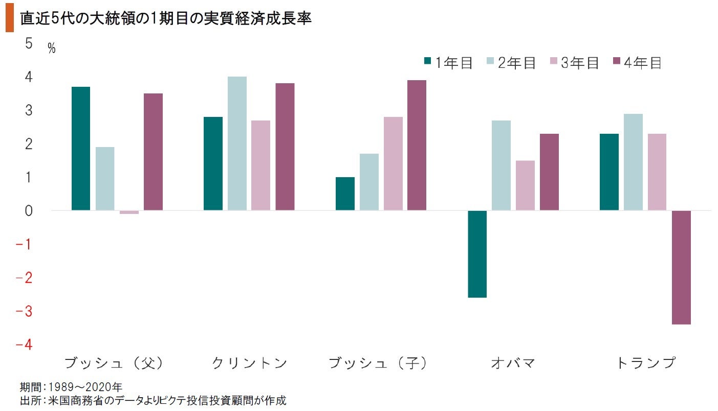 直近5代の大統領の1期目4年間の実質経済成長率を追うと、クリントン大統領の場合、4年間を通じて好景気を謳歌、ブッシュ大統領(子)の場合は尻上がりに景気が良くなった。一方、オバマ大統領は、リーマンショックの影響を受け最初の年はマイナス成長だが、その後の建て直しに成功している。経済環境が現職大統領の追い風となり、この3人は再選されたのだろう。