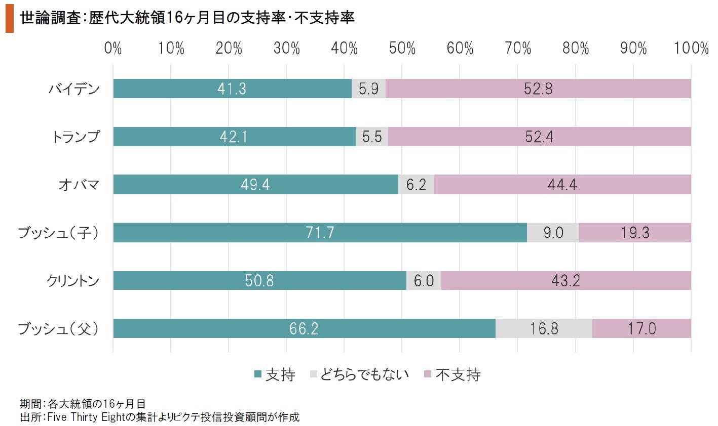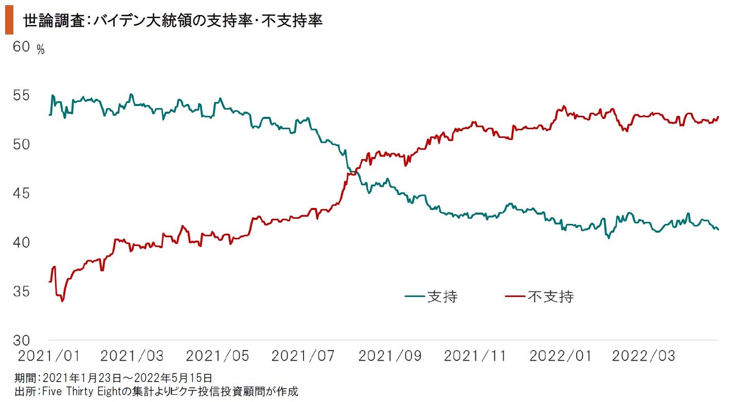 ブッシュ(父)大統領以降の5代の大統領に関し、就任から16ヶ月目の支持率を見ると、ブッシュ(子)大統領が70%を超えて最も高い。これは、米国同時多発テロにより、大統領が国民の求心力を集めていたからだろう。一方、最も低いのはドナルド・トランプ大統領の42%だが、足下、バイデン大統領はその水準も下回っている。中間選挙に赤信号が点灯したと言えよう。