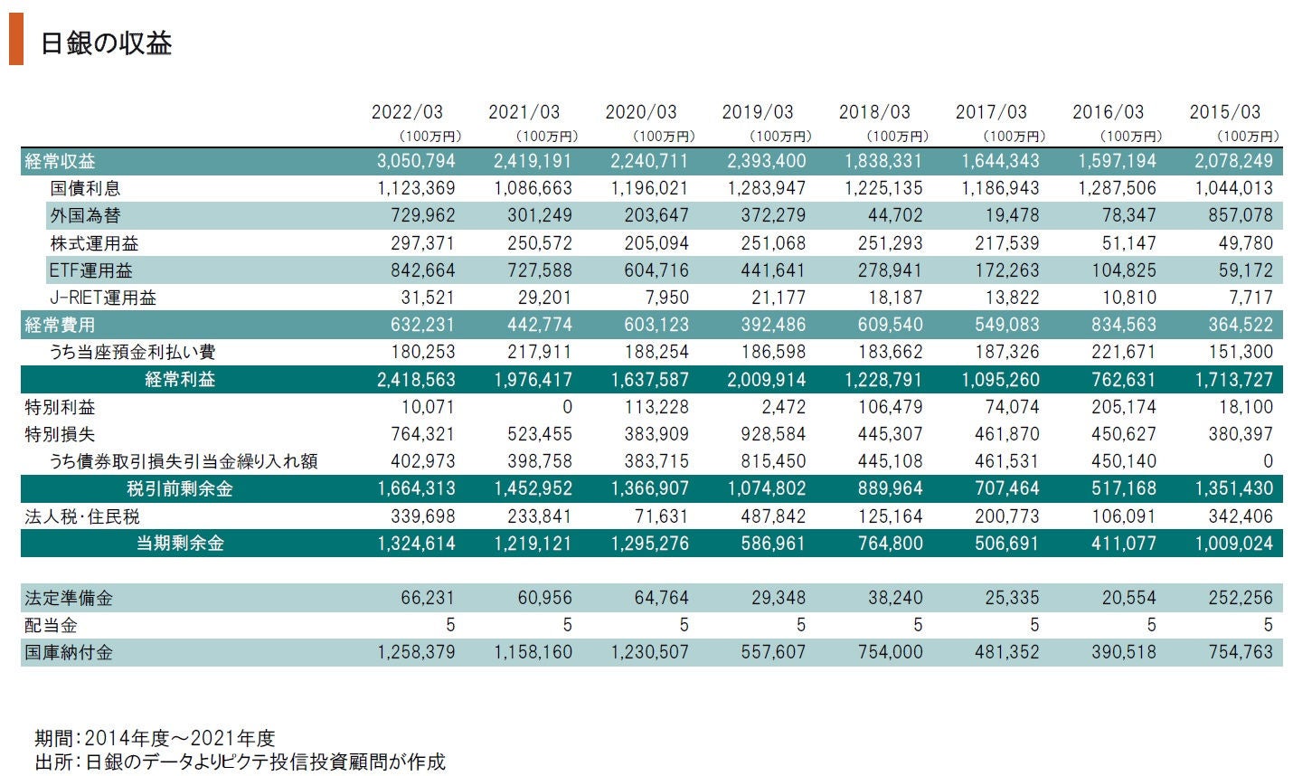 損益計算書を見ると、前期、日銀の経常収益は3兆508億円、経常利益は2兆4,186億円であり、いずれも過去最高を記録した。保有国債からの受取利息は前期比367億円増の1兆1,233億円、平均利率は0.21%である。日銀は国債の発行金利抑制に貢献している上、国税の他に国債の受取利息額を上回る1兆2,584億円を国庫納付金として政府へ納めた。