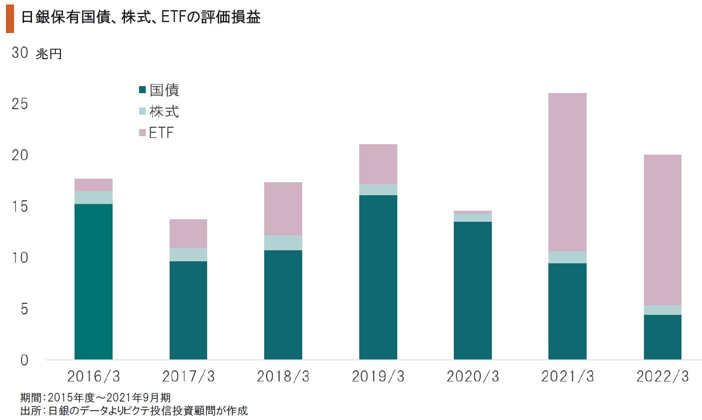 日銀が保有する国債の評価益は、2019年3月期に16兆360億円に達していたが、市場金利の上昇などから前期末には4兆3,735億円へと縮小している。一方、ETFは簿価が36兆6,255億円、時価が51兆3,109億円で、評価益は14兆6,854億円だった。国債とETFの評価益は景気動向に従ってバランスしており、現時点で大きな問題は生じていない。