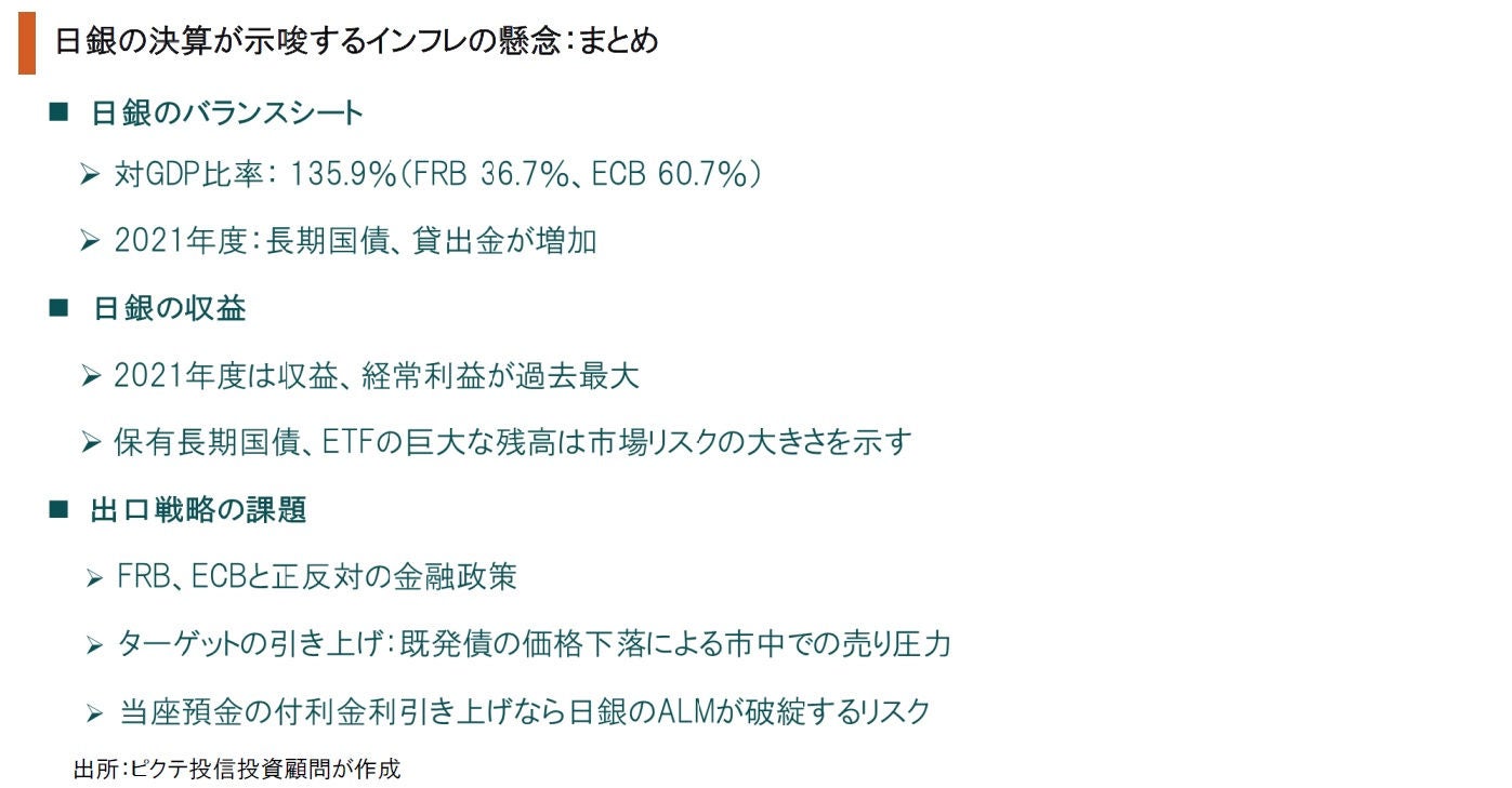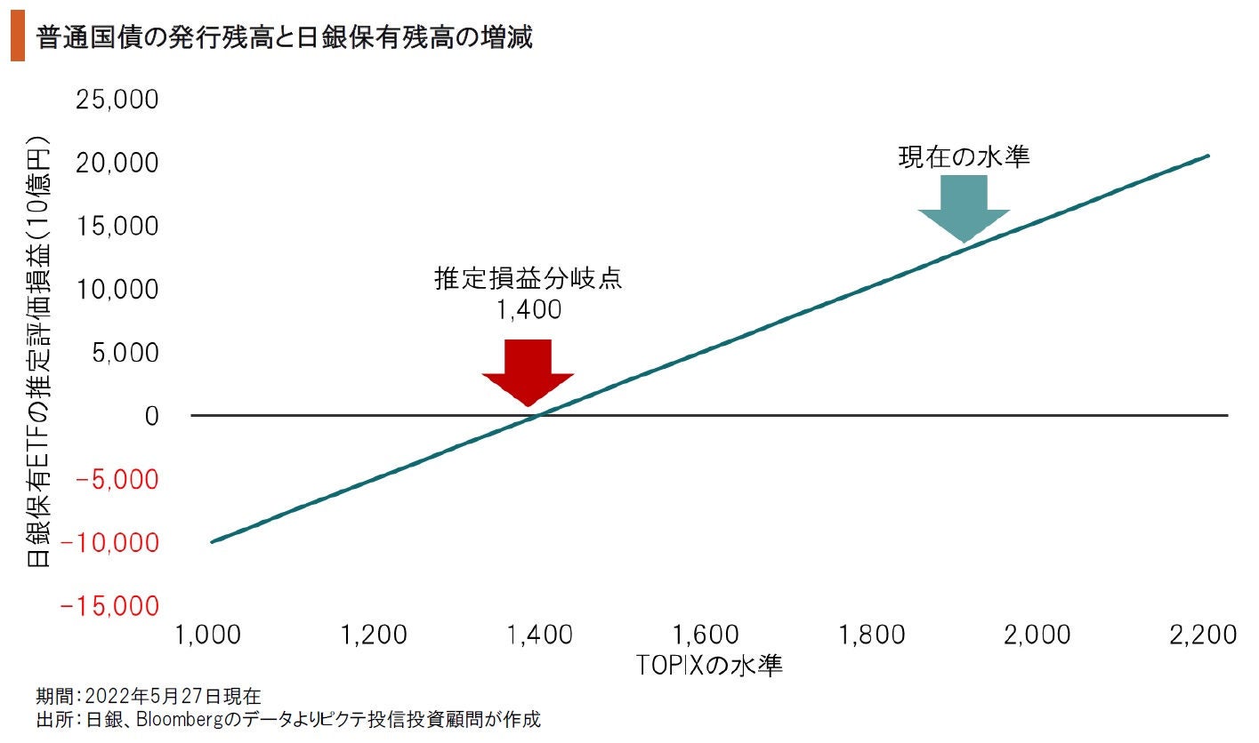 2022年3月末、日銀の保有する長期国債の簿価は511兆2,312億円、ETFは36兆5,657億円だった。ETFの損益分岐点はTOPIX1,400前後と推計される。市場環境によりリスク性資産が含み損となる可能性はあるが、外貨の評価損により債務超過に陥った旧西ドイツ連銀などの例を見ると、直ちに金融政策への信頼性に影響を与えるわけではないと想定される。