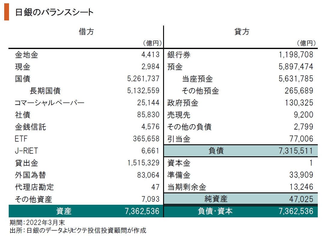 2022年3月期における日銀のバランスシートを前期末と比較すると、資産は21兆6,969億円増加しており、そのうち15兆4,541億円は長期国債の保有残高が積み上がったことによる。また、新型コロナ対策で貸出金が前期比25兆6,926億円増え、総額151兆5,328億円に膨らんだ。負債側では、資産の拡大に連動して当座預金が40兆6,082億円増加している。