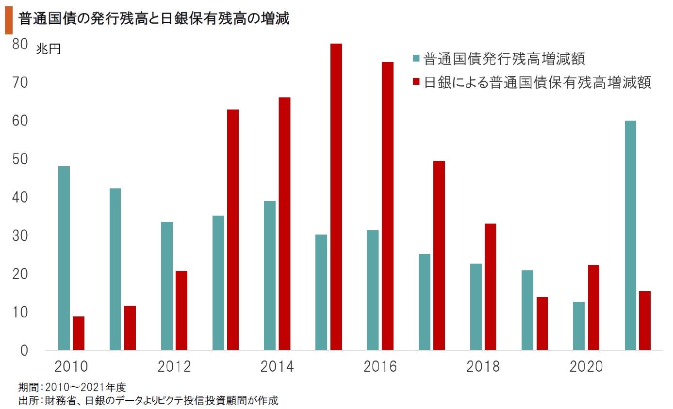 量的・質的緩和の下、2013年度から2021年度まで、普通国債の発行残高は276兆7,794億円増加した。一方、日銀が保有する普通国債は419兆8,820億円増加している。日銀が出口戦略で10年国債の目標利回りを引き上げれば、価格下落を懸念して既発債の保有者は国債を売るのではないか。その場合、日銀は物価上昇局面で量的緩和を強化することになる。