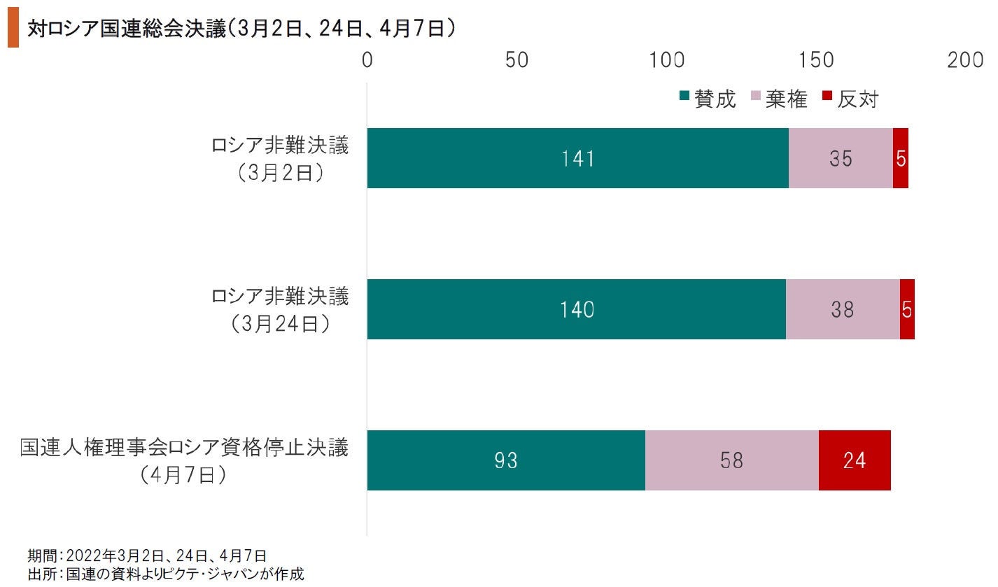 ロシアによるウクライナ侵攻に関し、国連安全保障理事会はロシア自身の拒否権で機能していない。そこで、米国、欧州、日本は国連総会の場でロシアへの非難決議を2回、ロシアを人権理事会の資格停止とする決議を1回行った。人権理事会に関する決議は採択されたものの、賛成国が大幅に減少する一方、新興国のなかに棄権、反対に回る国が増加した。
