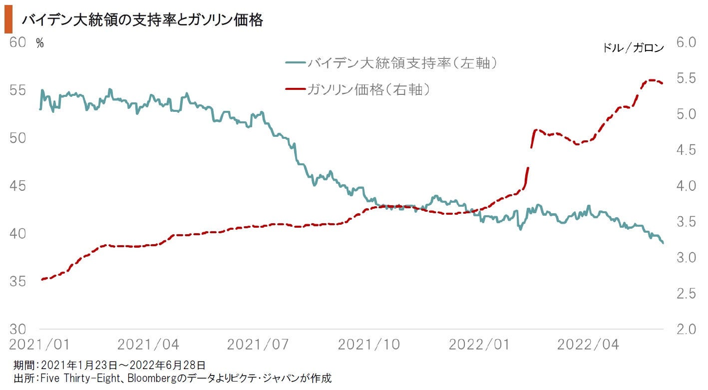 米国では、ジョーバイデン大統領の支持率が就任以来最低の39.0%へと低下、不支持率の55.5%を15ポイント以上下回った。同時期のドナルド・トランプ前大統領の支持率(42.3%)にも届いていない状況だ。今春以降の支持率の一段の低下は、ガソリン価格に代表される物価高騰によると考えられる。ロシアへの経済政策の影響は、政権への不満を生んでいるようだ。