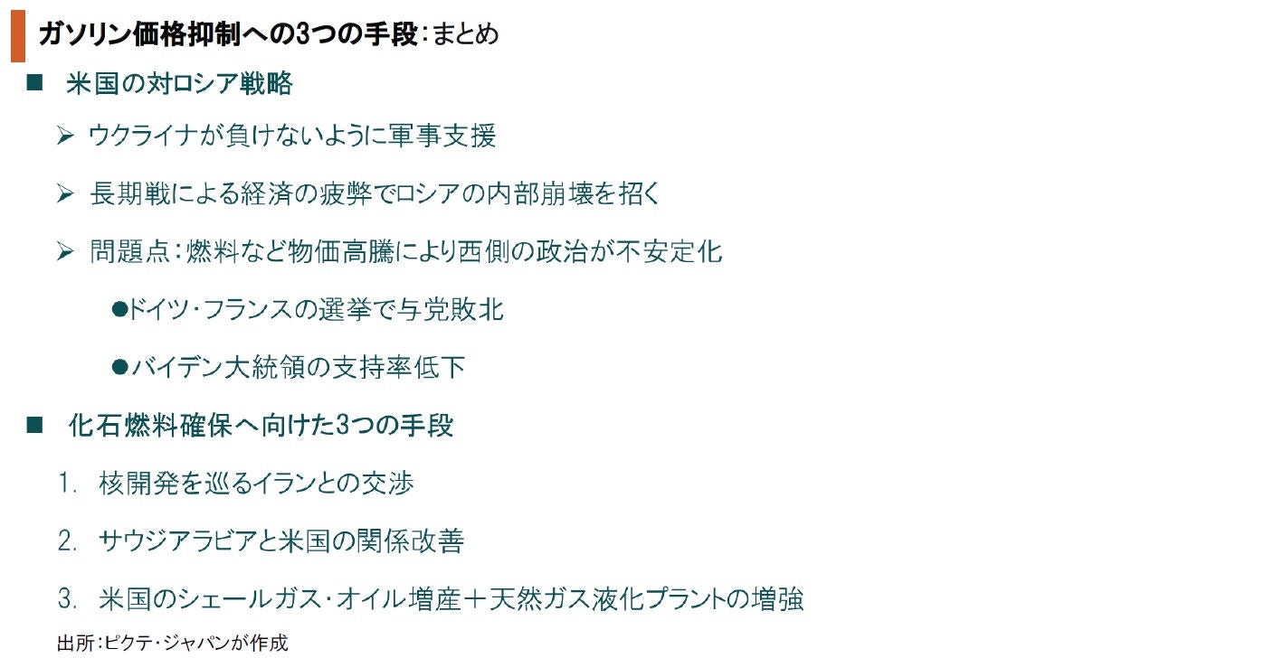 ロシアへの制裁措置は、エネルギーなど資源価格の高騰を通じて西側諸国にも経済的なダメージをもたらし、主要国では政治が不安定化している。これに対して、1)核開発を巡るイランとの協議再開、2)サウジアラビアと米国の関係改善、3)米国のシェールガス・オイルの増産と天然ガス液化プラントの増強・・・3つの対策が講じられつつあるようだ。これらのハードルが低いわけではないが、具体策の進捗が市場のコンセンサスになることで、一段の価格高騰を抑制する効果は期待できる。また、米国の場合、ロシアのシェアを奪って原油、天然ガスの輸出を拡大することにより、資源国としての経済の強さを世界に再認識させる可能性もあるだろう。