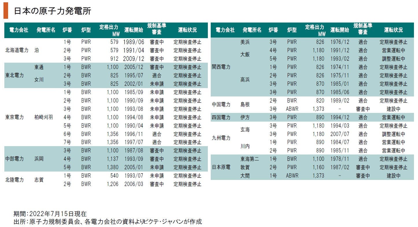 東日本大震災前、国内では54基の商業用原子炉が稼働していた。これまでに22基の廃炉が決まる一方、新たな規制基準をクリアして稼働した原子炉が10基、審査に合格したが未稼働の炉が7基、審査申請中の炉が9基ある。岸田首相は今冬における9基の稼働を強調したが、それは既稼働10基から定期検査に入る1基を除いた数字であり、新たな稼働を意味しない。