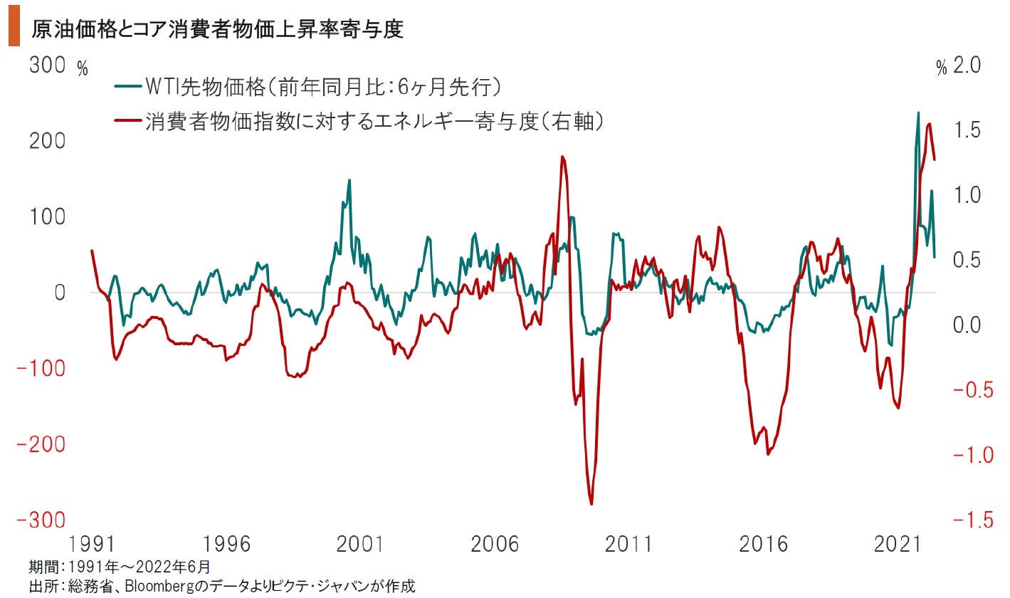 消費者物価に対するエネルギーの寄与度は、WTI原油先物価格に6ヶ月程度遅行する。WTI原油先物価格が100ドル/bbl程度で推移した場合、2023年1-3月期にはエネルギーが消費者物価に与える影響は中立的になる見込みだ。ただし、ウクライナ戦争は予断を許さず、資源大国であるロシアが国際社会に復帰するには極めて長い時間を要するだろう。
