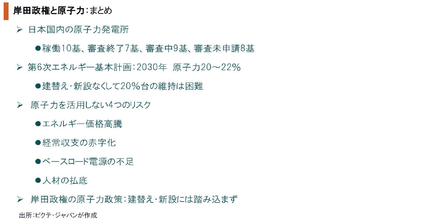 原子力発電所の新設・建替えがない場合、1)電力価格の高止まり、2)経常収支の赤字化、3)ベースロード電源の不足、4)専門性の高い人材の枯渇・・・4つのリスクがある。ドイツの例を見れば、再生可能エネルギーは不安定であり、確実に計算できるベースロードとの併用でなければ、電源構成の比率を上げることは難しい。一方、社会・経済のデジタル化、自動車のEV化などを考えると、電力の安定供給は国際競争力の鍵になるだろう。しかしながら、岸田首相は、今のところ原子力の積極活用に踏み込むことには慎重のようだ。電力・エネルギーに関する明確な戦略の欠如は、将来に向けた日本経済の不透明要因の1つと考えざるを得ない。