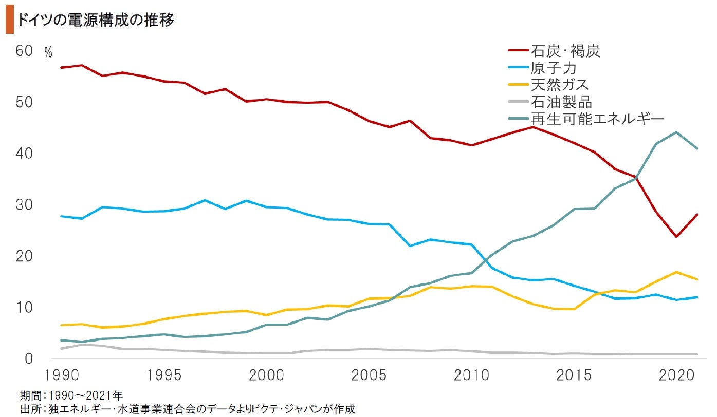2021年、ドイツの総発電量に占める再生可能エネルギーの比率は4.0%ポイント低下した。欧州の異常気象による風力発電の出力低下が要因だ。この事象は、再エネの活用には、安定したベースロード電源が必須であることを改めて示した。ドイツの場合、ロシアからの天然ガス調達も難しくなり、そのエネルギー政策は大きな岐路に立ったと言えるのではないか。