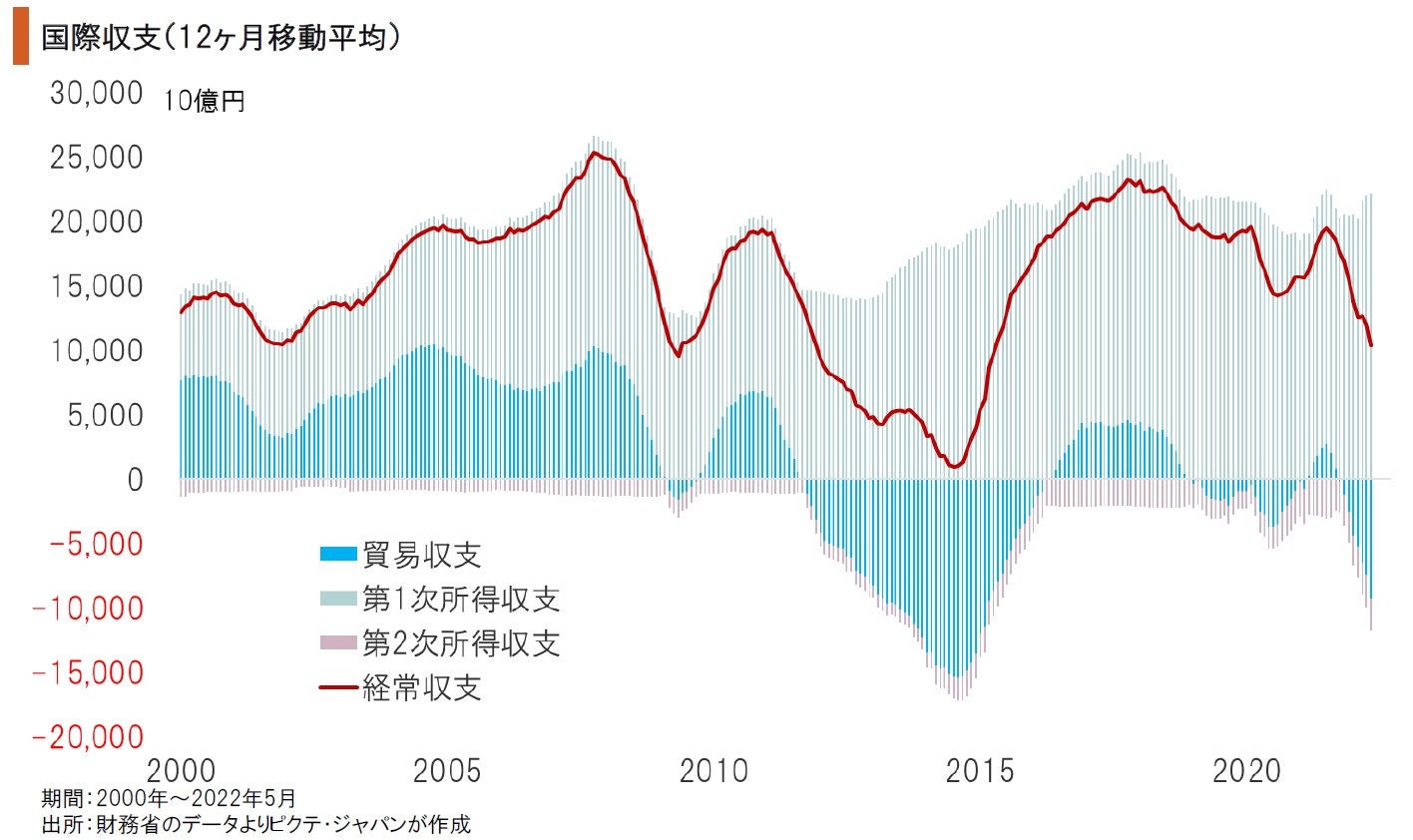 資源価格の高騰と円安の相乗効果により、貿易収支の赤字は珍しくなくなった。一方、所得収支は大幅な黒字を維持している。ただし、原油、天然ガス、穀物などの資源価格が一段と上昇した場合、経常収支が赤字になる可能性は否定できない。人口減少・高齢化の下で経常収支の赤字が常態化すれば、為替や国債の市況にも大きな影響が及ぶことになるだろう。