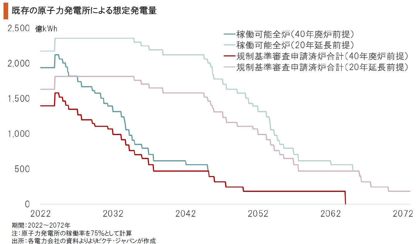 原子炉等規制法の規定では、発電用原子炉の運転可能期間は40年だ。ただし、特例で20年まで延長することが可能である。現存する原子炉が全て稼働したとしても、40年ルールだと2020年代に発電量は急減する。また、60年の場合でも、2040年代後半にはなし崩し的に脱原子力とならざるを得ない。これは、カーボンニュートラルの実現を極めて難しくするだろう。