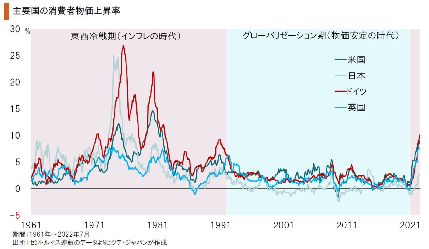 1991年12月の旧ソ連崩壊により、世界は米国主導の下でグローバリゼーションの時代に突入した。市場の統合が進んだことで、労働コストの低い韓国、ASEAN諸国、中国、メキシコなどの製品供給力が拡大し、先進国では30年間に亘って物価が安定したのである。しかしながら、米中両国の対立が先鋭化、世界は新たな分断の時代を迎え、インフレ圧力が強まっている。