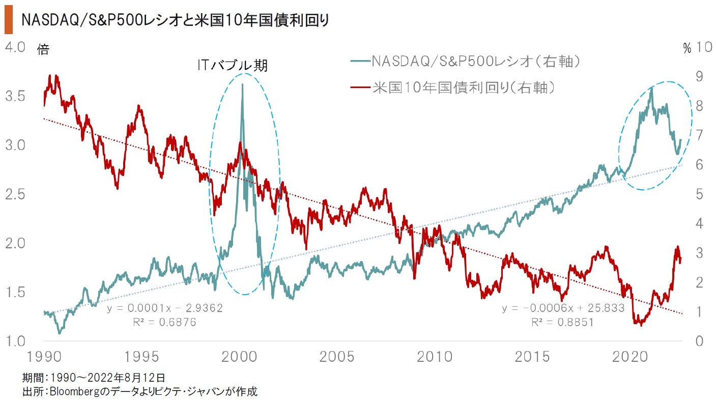 成長株が主導するNASDAQ総合指数をS&P500で割ったレシオは、2000年代初頭のITバブル、そして最近の新型コロナ禍バブル期を除いても、趨勢的に上昇してきた。これは、過去30年に亘り成長株が概ね米国市場を主導してきたことを示すだろう。その背景は長期的な市場金利の低下ではないか。市場のリスク許容度を高めたと考えられるからだ。