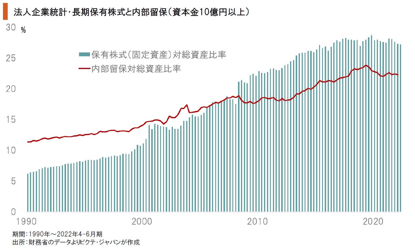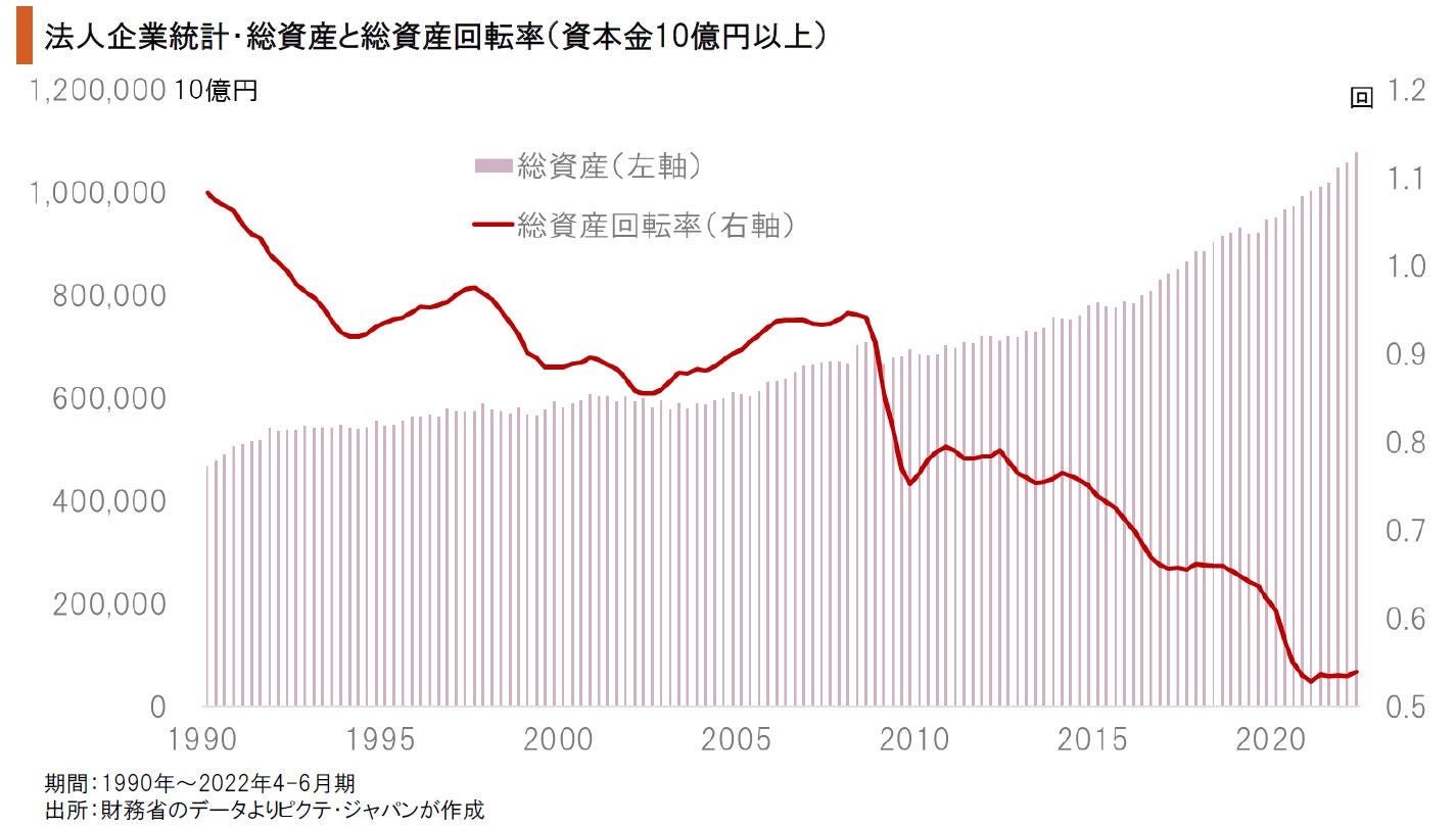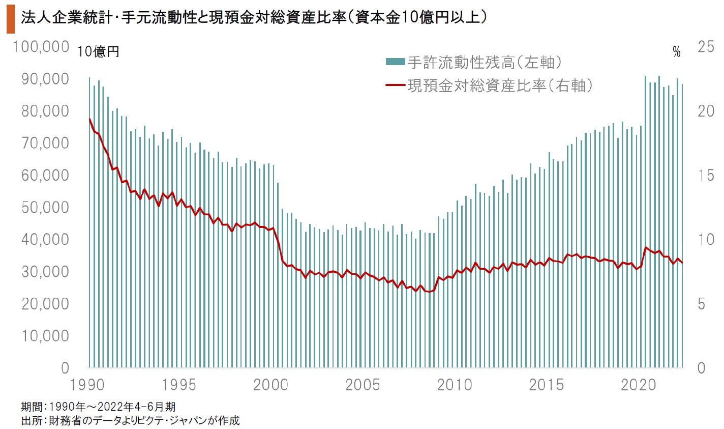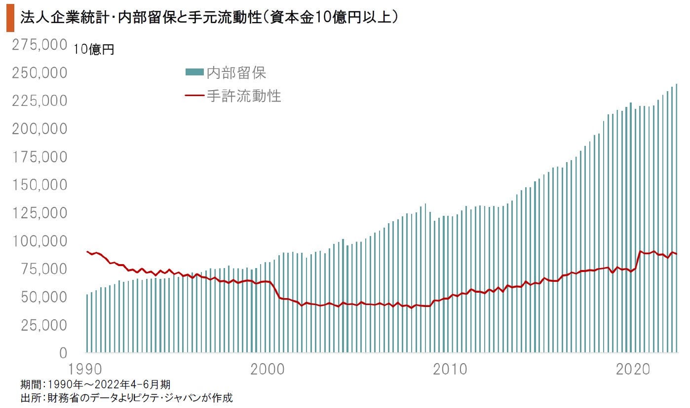 日本企業のROEが低い理由は、株主資本が内部留保で膨らんだことだ。従って、ROEを上げるためには、株主還元を一段と強化することにより、内部留保を取り崩さなければならない。もっとも、2022年6月末、内部留保が239兆9,878億円に達する一方、手元流動性は88兆2,707億円だった。肥大化した資産の現金化がなければ、大胆な株主還元も難しいだろう。