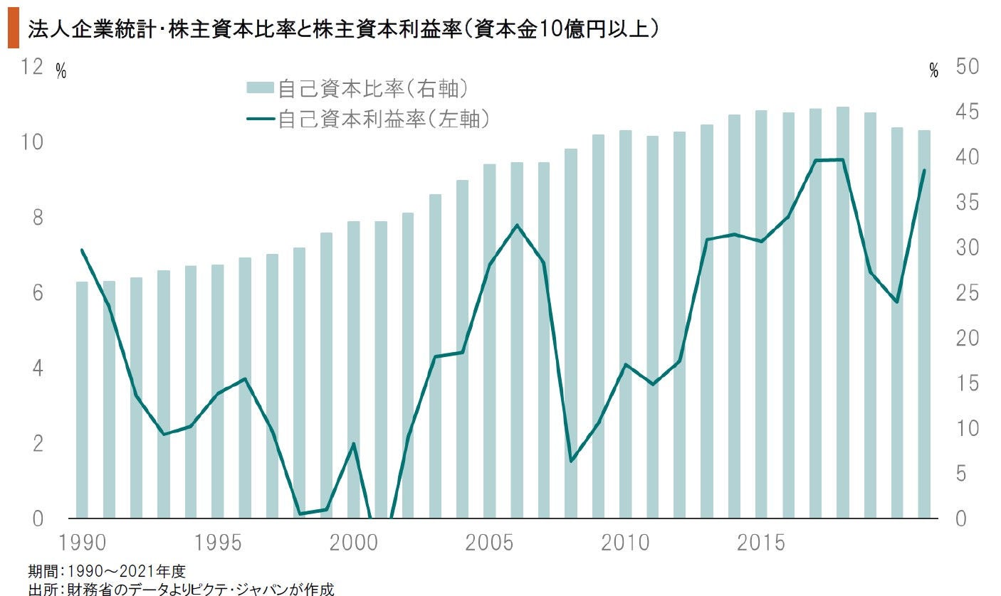 7年8ヶ月に亘った第2次安倍政権の初期、2014年6月24日に閣議決定された『日本再興戦略 改訂2014』では、「グローバル水準のROE」が目標とされていた。数字は明示されていなかったものの、米欧主要国の2桁パーセントがターゲットだったと言えよう。しかしながら、その後、日本企業の業績が改善する一方で、ROEは1度も10%を超えていない。