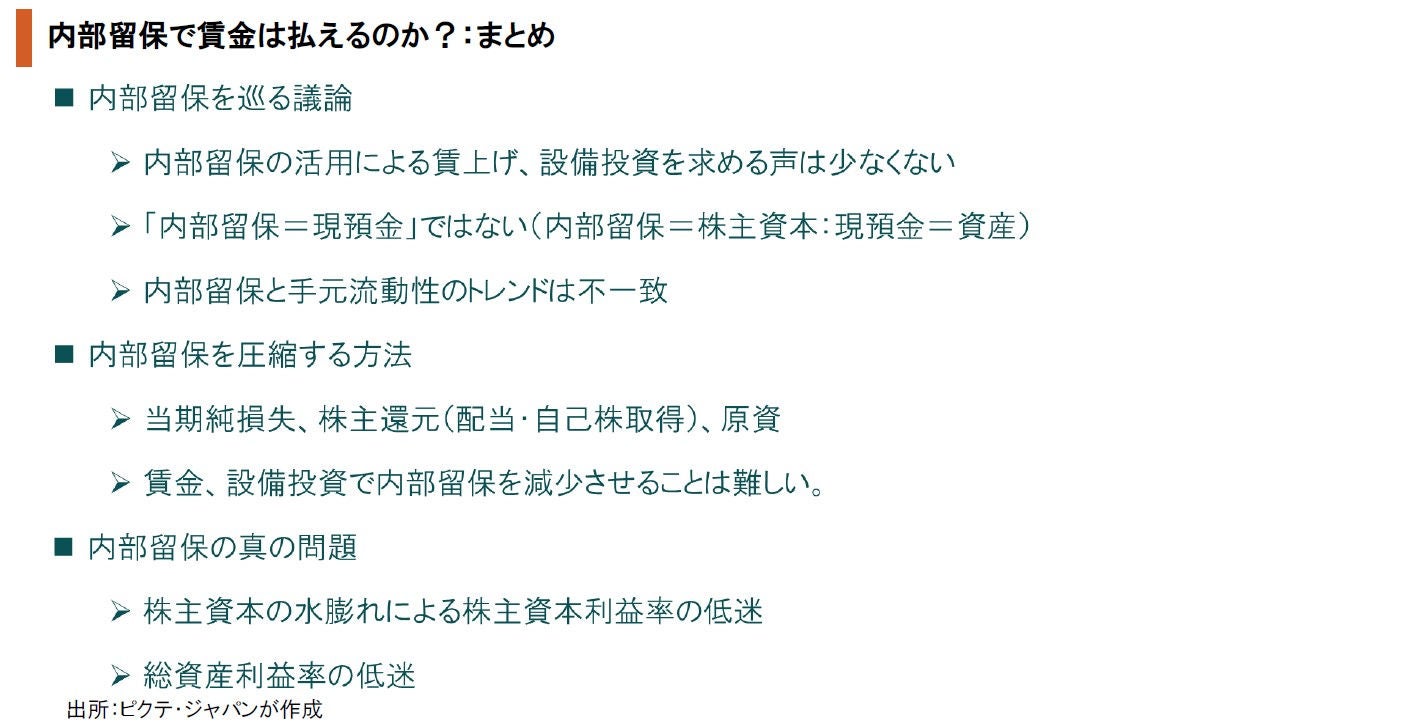 9月1日、財務省は2022年4-6月期の法人企業統計を発表したが、この統計に関する世の中の注目は引き続き内部留保にあるようで、「初の500兆円台」が話題になっていた。政界やメディアにおいては、内部留保を活用した賃上げや設備投資を求める声は少なくない。しかしながら、それは会計に関する大きな事実誤認に基づいているのではないか。バランスシート上、資本の部に計上される内部留保は、資産である現預金の残高とは連動しない。資本金10億円以上の大企業の場合、内部留保は既に投資され、資産計上されている可能性が強いのだ。むしろ、日本の大企業の最大の問題は、資産総額がビジネスに比して肥大化しており、資本利益率が低いことだろう。ちなみに、内部留保を減らす方法は、1)期間損益の赤字、2)配当、自社株取得など株主還元、3)減資・・・基本的に3つしかない。また、内部留保は税引き後の利益剰余金の累積なので、内部留保課税は明らかに二重課税となる。むしろ、日本企業に必要なのは、適正規模に資産を圧縮し、内部留保を株主還元の原資とすることだろう。そのためには、労働移動を促進する雇用制度改革などが必要なのではないか。