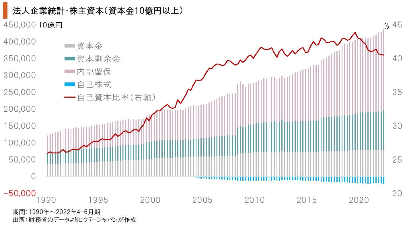 資本金10億円以上の金融・保険を除く大企業の場合(以下対象同じ)、2022年6月末の株主資本は436兆700億円だった。内訳は資本金79兆6,767億円、資本剰余金116兆4,055億円、利益剰余金262兆2,762億円、自己株式▲22兆2.884億円である。60%を占める分厚い内部留保により、自己資本比率は40.5%と非常に高い水準を維持している。