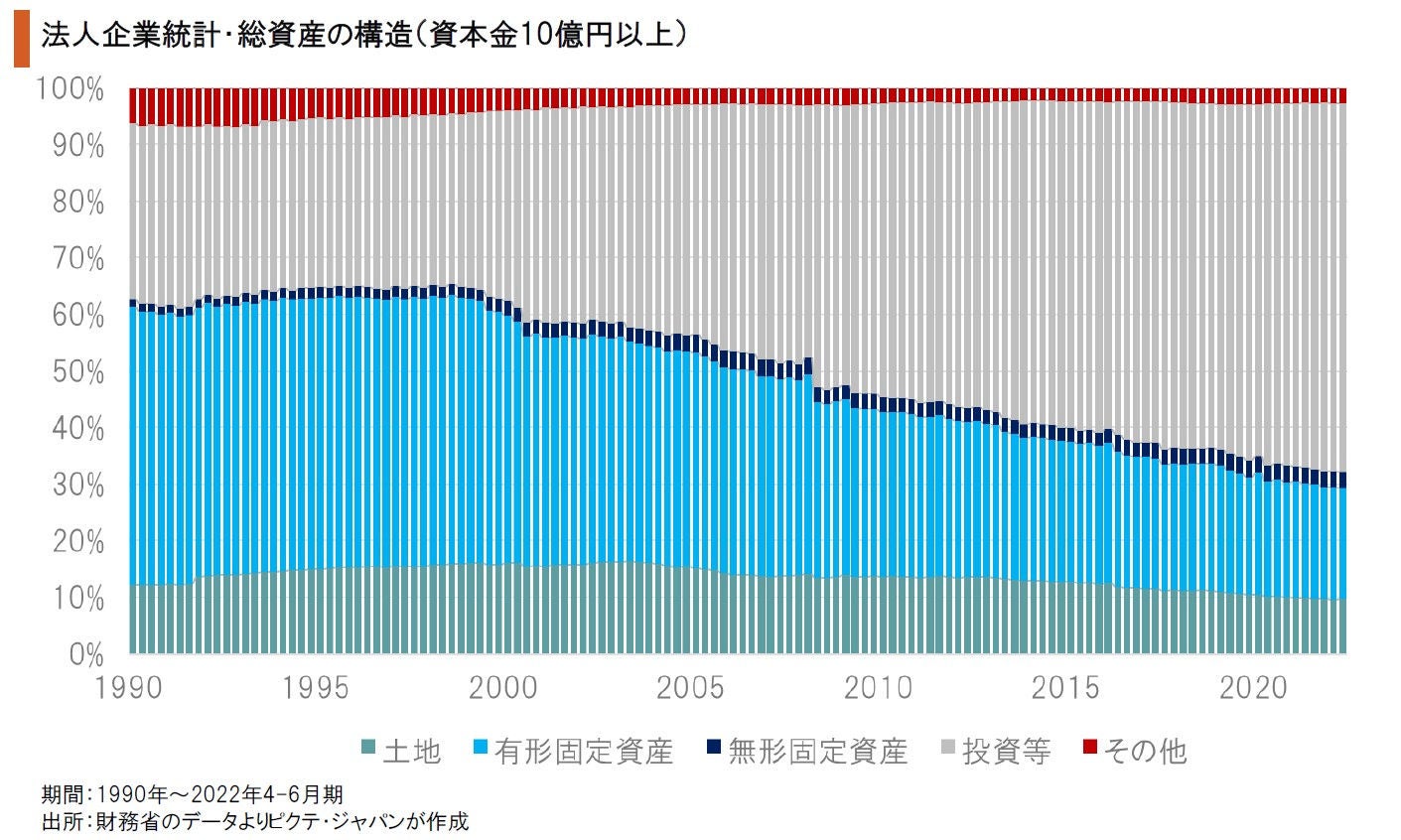 過去10年間の総資産増加額のうち、69.0%に相当する236兆52億円は固定資本であり、特に投資等が204兆9,346兆円の大幅な伸びになっている。株式持ち合いの解消が進む一方、生産拠点の海外シフトに伴い海外子会社の保有残高が急増した。他方、雇用問題を抱えており、国内におけるインフラの圧縮の遅れが、資産の肥大化を招いたのではないか。