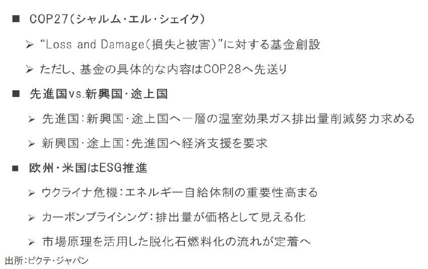 COP27は「損失と被害」に関する基金の設立で合意したが、具体策は次回会議へ先送り、国際社会の分断の下での調整の難しさを浮き彫りにした。一方、ロシアによるウクライナ侵攻を受け、西側主要国にとって、エネルギーの自給体制確立が喫緊の課題になっている。カーボンプライシングにより温室効果ガス排出コストの見える化を進め、エネルギーの確保、排出量抑止の両立が求められているわけだ。この古くて新しい課題は、市場原理の活用が鍵を握っている。ESGを軸とした先進的な技術開発や取り組みにより、新たなビジネス及び投資のチャンスがむしろ広がりつつあると言えるかもしれない。