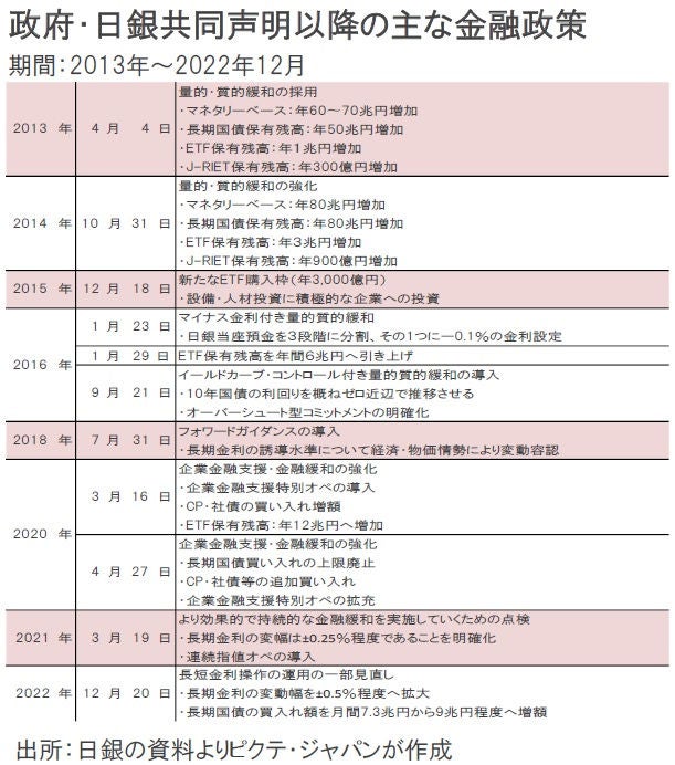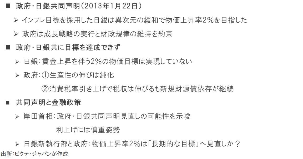 政府・日銀共同声明が締結された際、日銀のトップは白川方明総裁だった。安倍首相(当時)は、黒田東彦アジア開発銀行総裁を後任とし、黒田体制の下で日銀は量的・質的緩和を採用した。その後も共同声明に沿って2%の物価目標を目指し、日銀は他の主要中央銀行に類を見ない大胆な金融緩和を実施してきた。しかしながら、共同声明から10年を経ても、物価目標は実質的に達成されていない。