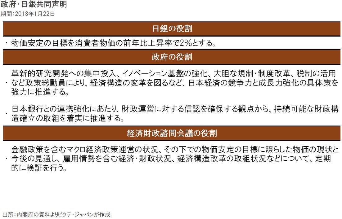 政府・日銀共同声明において、日銀は初めて2%の物価目標を採用した。第2次安倍政権は、日銀法改正の可能性を明確にし、日銀に受け入れを迫った結果と言える。一方、政府は成長戦略の実施による生産性の改善、財政規律の維持を約束した。日銀及び財務省は、日銀による量的緩和により、歯止めなき財政拡張となるリスクを懸念して、安倍政権に釘を刺す意味があったのではないか。