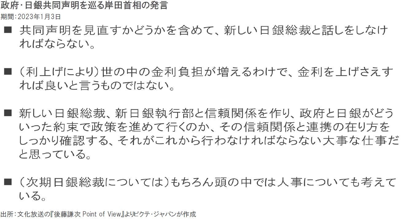 岸田首相は、1月3日に放送されたラジオ番組において、次期日銀総裁と信頼関係の構築に努め、その上で政府と日銀の役割を明確にするため共同声明を見直す可能性を示唆した。一方、利上げに関しては、副反応が大きいことを指摘、慎重な姿勢を印象付けたと言えよう。もっとも、これまで日銀が共同声明を強く意識して金融政策を運営してきたことから、その見直しの行方に注目すべきことは間違いない。
