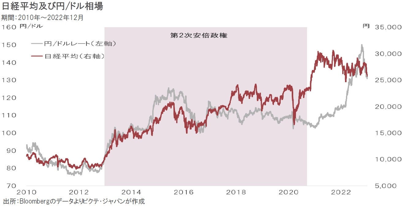 第2次政権発足当初、安倍首相(当時)は、「3本の矢」として成長戦略の実行を重視していたと見られる。しかしながら、黒田東彦総裁の下で日銀が量的・質的緩和を実施すると、デフレの要因の1つであった円高が終息、それに伴って株価も急速に上昇した。そうした市場の動きを受けて、安倍政権はデフレ対策を専ら金融政策に任せ、2015年の平和安全法制など外交・安全保障に注力したのだろう。