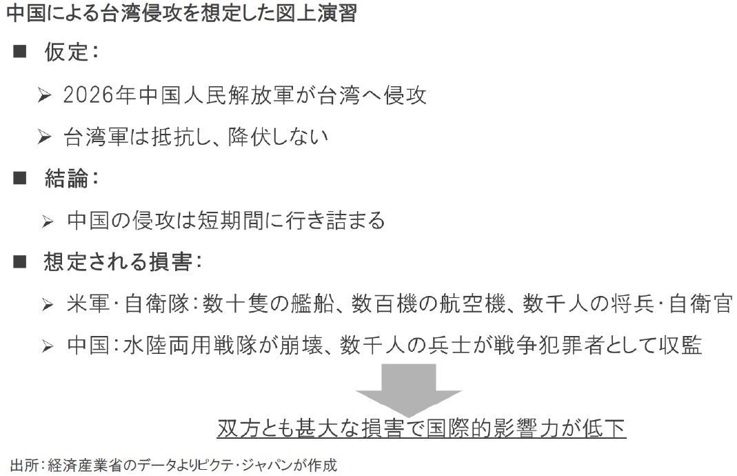 CSISは、中国による台湾武力侵攻を想定、24回の図上演習を実施した。結論は、「中国の侵攻は短期間に行き詰まる」である。ただし、日米両国にとっても、米軍及び自衛隊が多くの戦力を失うとの厳しい結果だった。中国は台湾への武力侵攻ではなく、内政問題として治安維持のため警察部隊の投入を検討するのではないか。この戦略は、次期台湾総統が中国に近い人物だった場合に可能性が高まるだろう。
