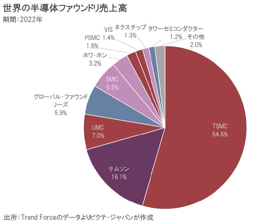 半導体売上高の17.0%に相当する1,024億ドルはファウンドリが製造しており、この業界におけるTSMCのシェアは50%を超える。さらにUMCなどを加えると、台湾企業のシェアは市場規模の約3分の2だ。日米両国はTSMCの工場を誘致、有事に際してのサプライチェーン維持に注力してきた。しかしながら、中国が台湾を掌握すれば、技術面での力関係の変化を含め、様々な分野に影響が避けられないだろう。