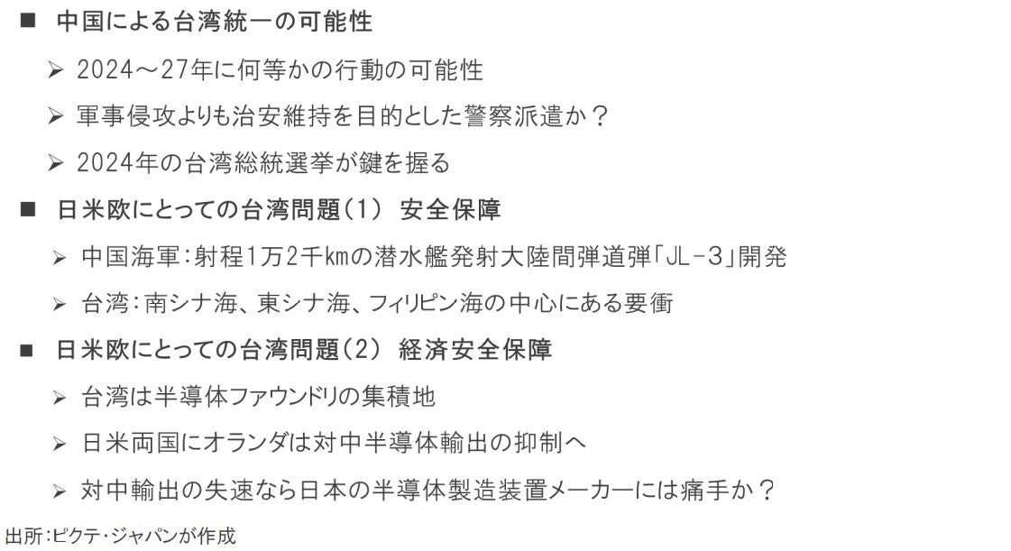 台湾情勢は、2024年の蔡英文総統の退任に向け、さらに緊迫度を増す可能性が強い。中国が武力侵攻する確率は高くないとしても、習近平共産党総書記が任期切れとなる2027年秋までの間に、何等かの行動に出るシナリオは否定できない。米国は台湾への協力を強化、現状の維持に注力している。一方、仮に中国が台湾を統一した場合に備え、日本、韓国、オランダを巻き込み、半導体サプライチェーンの再構築を急ぐ見込みだ。ゼロコロナ政策が放棄され、中国経済は再加速する可能性がある。ただし、中長期的に考えれば、台湾問題は、中国関連への投資をする上で大きなリスクと考えるべきだろう。