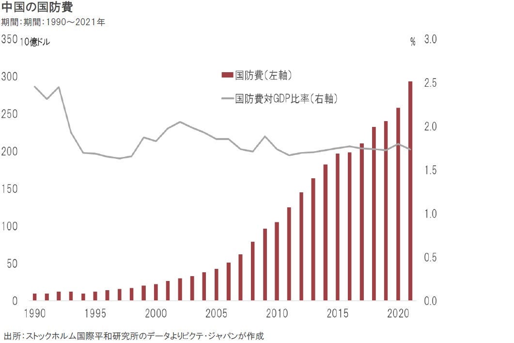 ストックホルム国際平和研究所(SIPRI)によれば、中国の国防費は1990年代後半から経済成長に伴って大きく増加、2021年まで20年間の伸び率は年平均12.8%に達した。絶対額では米国の3分の1強に止まっているとは言え、近年における軍事的存在感の高まりは明らかだ。特に空母の配備など海洋進出へ向けた土台作りを急いでいる模様で、将来の台湾統一を視野に入れているのではないか。