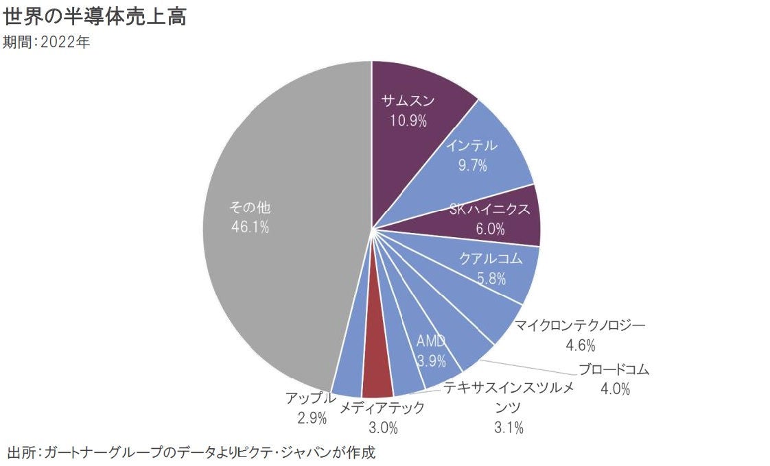台湾の重要性が高いもう1つの理由は半導体だ。ガートナーグループの推計によれば、2022年、世界の半導体市場は6,146億ドルだった。企業別では、サムスンが2年連続の首位をキープ、以下インテル、SKハイニクス、クアルコムと続く。トップ10のうち米国が7社、韓国2社、台湾が1社だ。もっとも、米国を中心に多くの企業は設計が中心であり、先端半導体の製造をファウンドリに委託している。