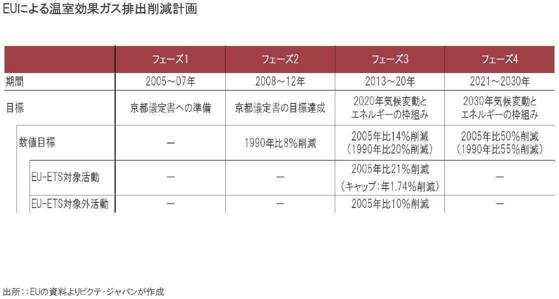 EUは2005年に排出量取引を開始したが、2010年代はリーマンショック、欧州通貨危機により景気が停滞、対象事業所の多くが削減目標達成にメドを付け、価格は低迷した。しかし、2019年12月に就任したEU委員会のウルズラ・フォンデアライエン委員長の下、2030年までの削減目標を1990年比で従来の40%から55%へ引き上げたことにより、価格が急騰、その後も高水準での推移が続いている。