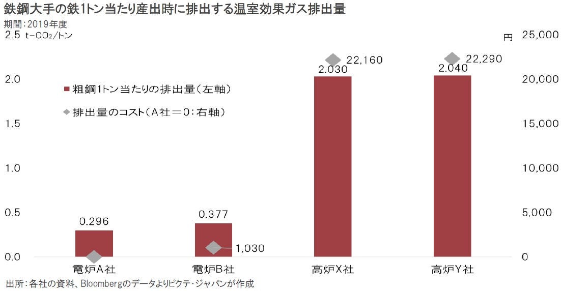 カーボンプライシングの影響は、日本の鉄鋼業界に当てはめて考えると分かり易い。電炉A社は粗鋼1トンの生産に際し排出した温室効果ガスが296㎏、B社は377㎏だった。これをEU-ETSの価格で計算すると、1トン当たり約1千円、販売価格に対し1%程度のコストの差になる。温室効果ガス排出量が金額として可視化され、生産コストに反映される場合、それが投資判断にも影響を及ぼすことになるだろう。