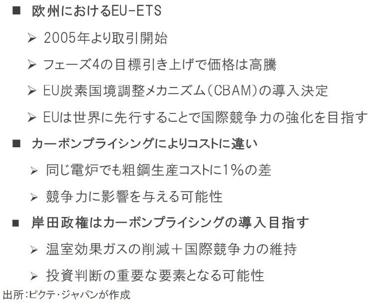 2022年11月29日の第4回GX会議において、岸田政権はカーボンプライシングの導入を決めた。賦課金方式と排出量取引を併用し、排出量価格の高騰が産業界に大きな影響を及ぼすことがないよう配慮するとされている。しかしながら、EUの例を見る限り、むしろ厳しい目標を設定することが、国際競争力を高める可能性は否定できない。日本は既に周回遅れの感も強く、岸田政権の取り組みが注目される。
