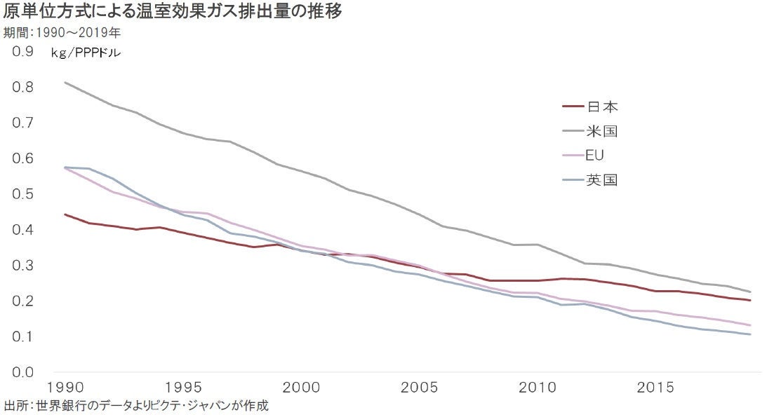 GDP1ドル(購買力平価)に要する温室効果ガス排出量を日米欧で比べると、2005年頃から日本の停滞が目立つようになった。2011年3月の東日本大震災で原子力発電所が停止した影響も大きい。その結果、2000年の時点で日本の原単位排出量は米国の63.0%だったが、2019年には90.0%まで差を詰められた。ジョー・バイデン政権の下、米国はこの問題への取り組みを新たな商機と考えているようだ。