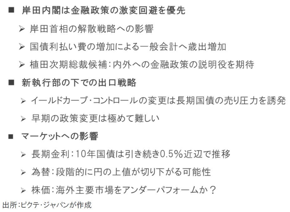 昨年秋以降、市場では日銀総裁の交代が、金融政策変更の契機になるとの見方が強まっていた。しかしながら、イールドカーブ・コントロール付き量的質的緩和は、出口戦略へ移行するのが極めて難しい政策だ。新日銀執行部が急速に出口戦略に向け舵を切るとは考え難い。むしろ、岸田首相は、そうした前提で総裁、副総裁候補を選んだのではないか。その結果、日銀の本格的な出口戦略は、円安や国債への売り圧力などを背景としたインフレにより、政策の修正を余儀なくされる形で実施される可能性がある。インフレのリスクに対する備えとしては、金融資産の国際分散投資が賢明な選択だろう。