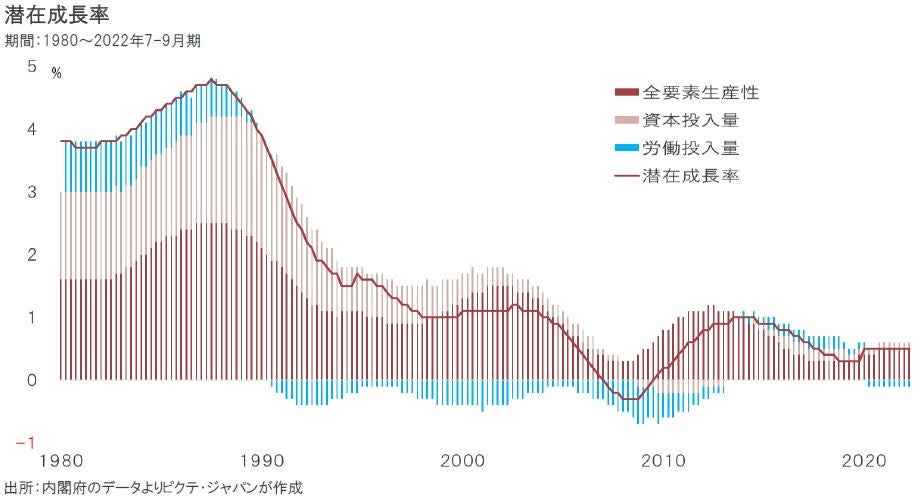 国の潜在成長率を生産面から見ると、労働投入量、資本投入量、全要素生産性(TFP)の伸び率の足し算で算出される。人口減少は構造的に労働投入量に影響し、潜在成長率を低下させる要因だ。人口動態を短期的に変化させることは困難なので、日本の成長率はTFPに大きく依存するだろう。もっとも、生産性の伸びを押し上げるには雇用制度改革など難しい課題があり、これも実現のハードルは低くない。